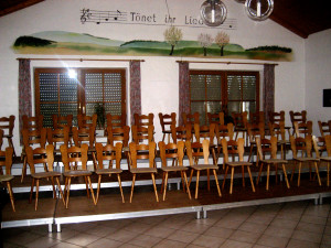 Im linken Teil des Gastraumes befindet sich, hinter geschlossener Faltwand, der Probenraum. Durch eine chorische Sitzordnung hat, dank abgestufter Höhen, jeder Sänger die Möglichkeit, einen uneingeschränkten Blickkontakt zum Chorleiter zu genießen. Zur Freude aller Beteiligten unterstützt dies im hohen Maße die Effektivität bei der konzentrierten Chorarbeit. Nach Probenende, bietet dann der Gastraum mit vorhandener Ausschanktheke eine nette Atmosphäre in geselliger und humorvoller Runde.